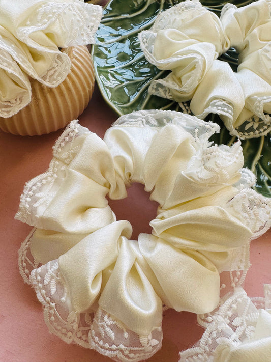 Snow White - Premium Satin Scrunchies with Designer Lace