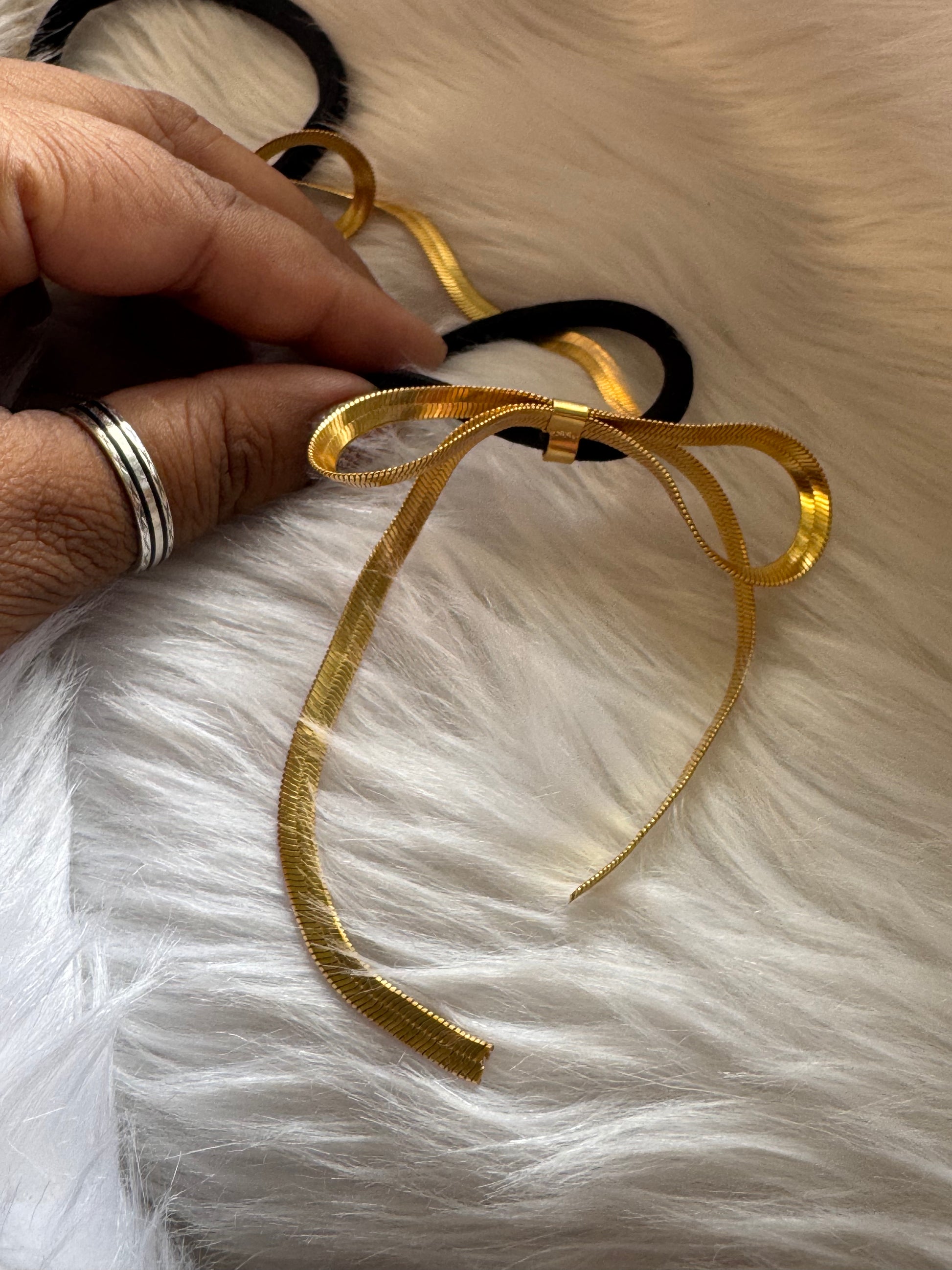 Add a delicate touch of luxury to your ponytail with the Golden Chain Bow Metal Rubber Band. This accessory features a beautifully sculpted metal ribbon loop that mimics the fluidity of a fabric bow but with the shine and durability of gold jewelry. Perfect for those who want a minimalist yet stylish hair accessory, it transforms a simple hair tie into a statement piece.