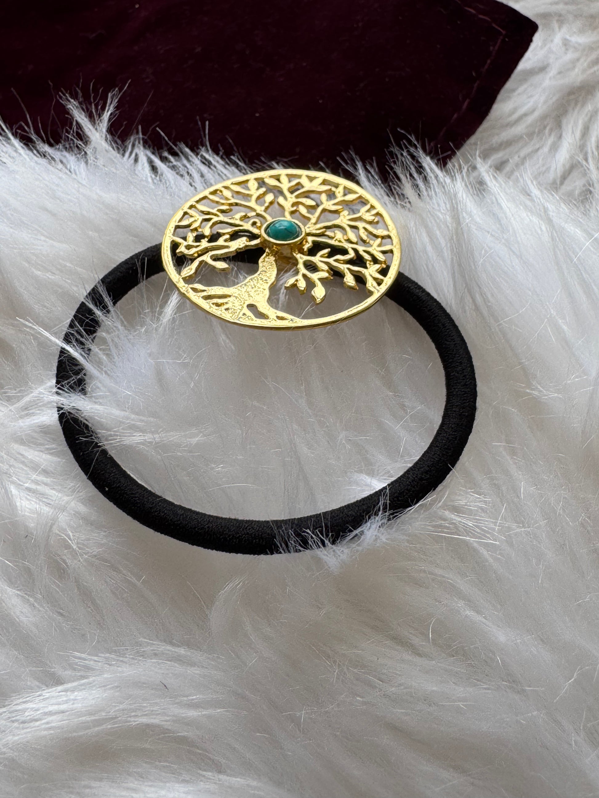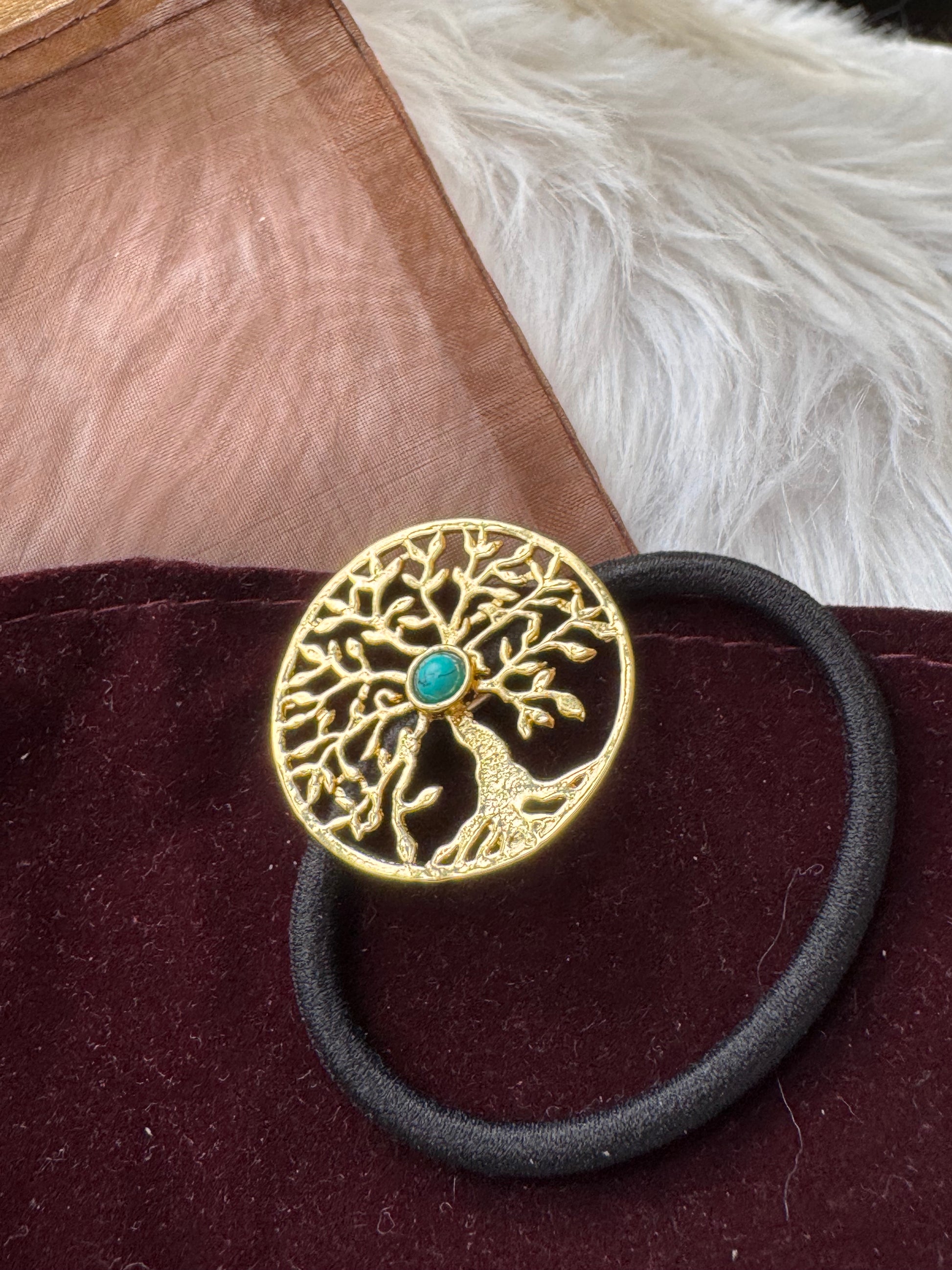 Channel boho-chic elegance with the Golden Tree Metal Rubber Band. This stunning piece features a detailed "Tree of Life" cutout design in gold, centered with a vibrant turquoise-colored stone. It is more than just a hair tie; it is a symbol of growth and beauty that adds a unique artistic flair to your messy buns or sleek ponytails.